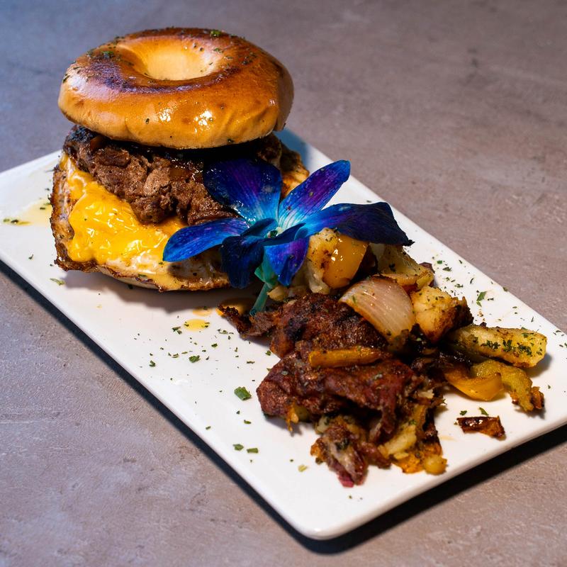 Grilled chopped steak served with onions on a grilled bagel. Topped with our house sauce and a side of potatoes.