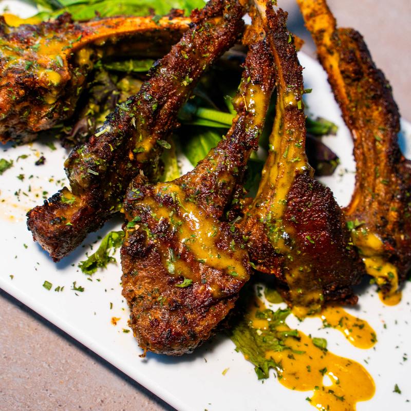 Pan-seared lamb chops seasoned with basil, thyme and a hint of rosemary. Drizzled in our house made Sweet Curry sauce served with a choice of 2 sides.