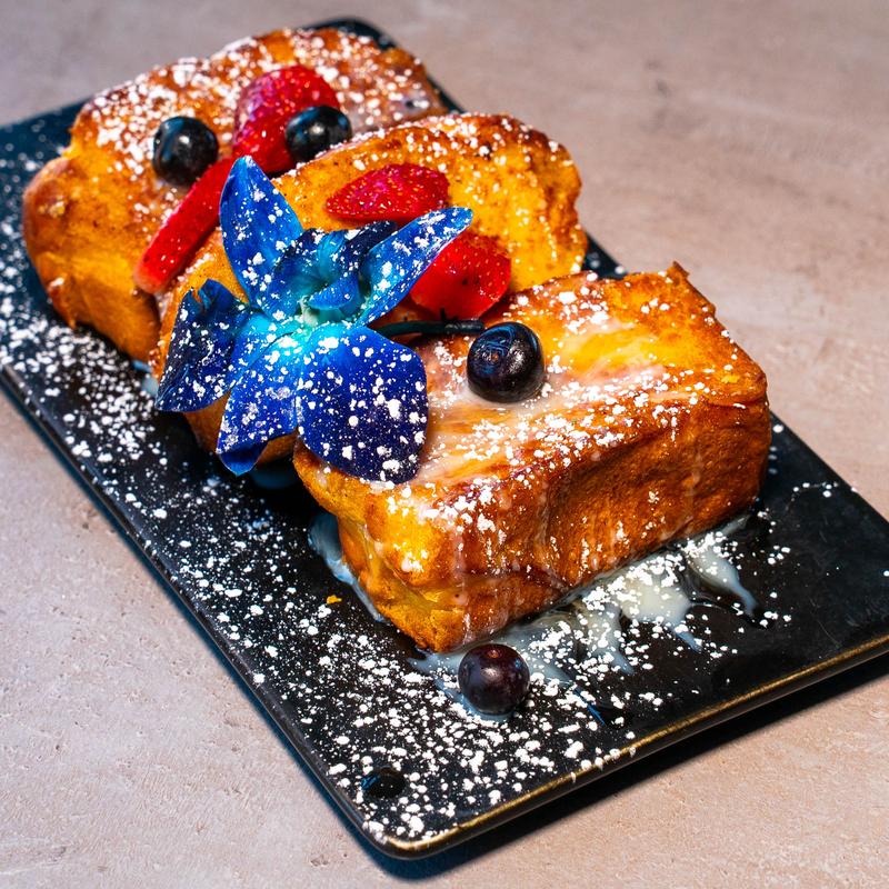 Chicken tenders served on top of Sweet French Toast topped with mixed berries, our house sweet drizzle and warm maple syrup with powdered sugar.